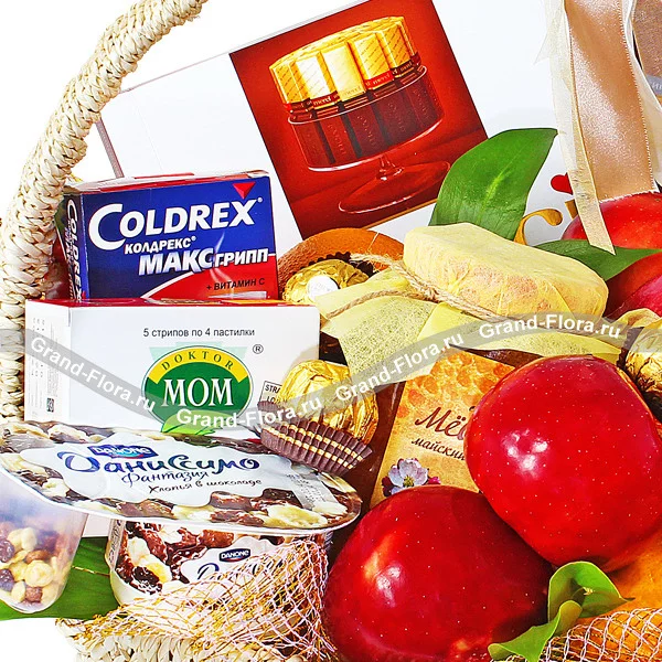 Люкс: коробка конфет "Merci" - 1 шт, шоколад"Коркунов" - 1 шт, чай "Lipton"(черный) - 1 шт,конфеты "Ferrero Rocher" - 1 шт, даниссимо - 1 шт, мед (500г.) - 1 шт, Coldrex МАКС Грипп - 1уп., Доктор МОМ - 1 шт, гранат - 1 шт, лимон - 1 шт,  яблоки - 0,5 кг, мандарины - 0,5 кг, корзина большая, декор.