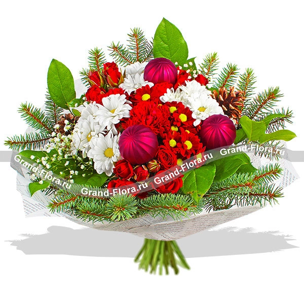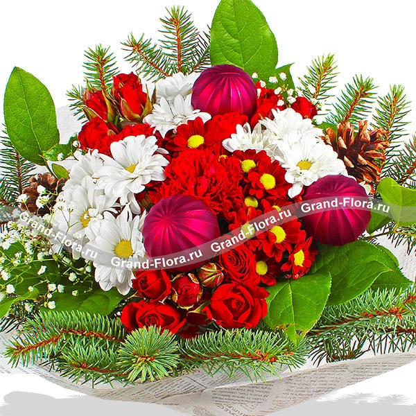 Стандартный (на фото): хризантема красная кустовая - 3шт., хризантема белая кустовая - 3шт., гвоздика красная - 3шт., роза красная кустовая - 2шт., гипсофила - 2шт., еловая ветвь, новогодний декор и зелень, фетр белый.