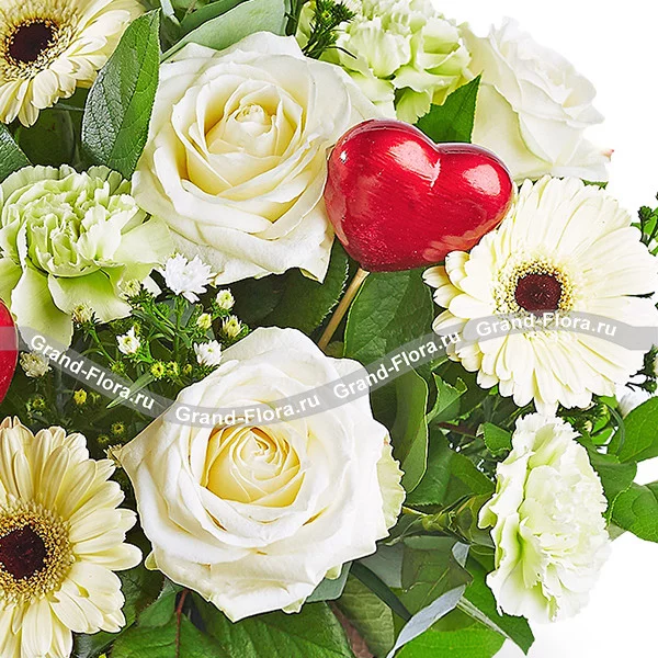 Уменьшенный: роза белая - 3 шт., гербера кремовая - 2 шт., гвоздика зеленая - 2 шт., рускус - 2 шт., гипсофила - 1 шт., эвкалипт - 1 шт., сердце красное (декоративное) - 1 шт., упаковка, бант красный. Примерный размер: 20Х20 см.